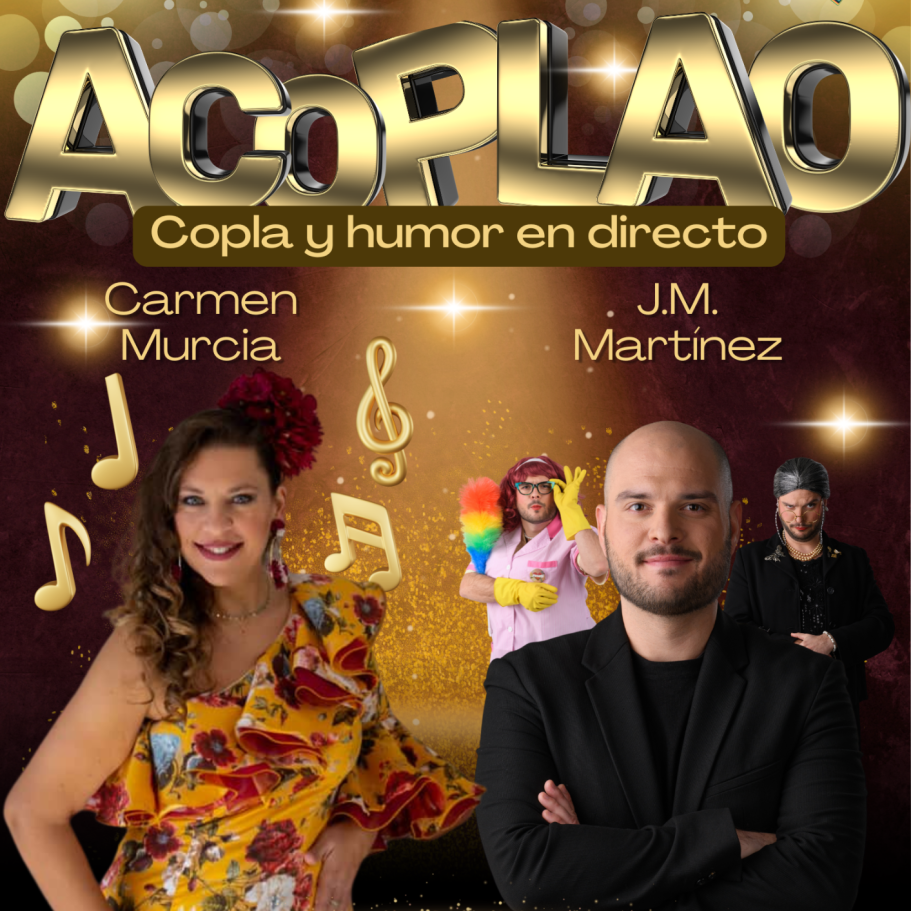 Un espectáculo que une copla en directo y humor en una propuesta fresca, dinámica y muy cercana con el público. La cantante Carmen Murcia interpreta grandes temas de copla mientras conduzco el espectáculo con humor, improvisación y la aparición de mis personajes más conocidos.